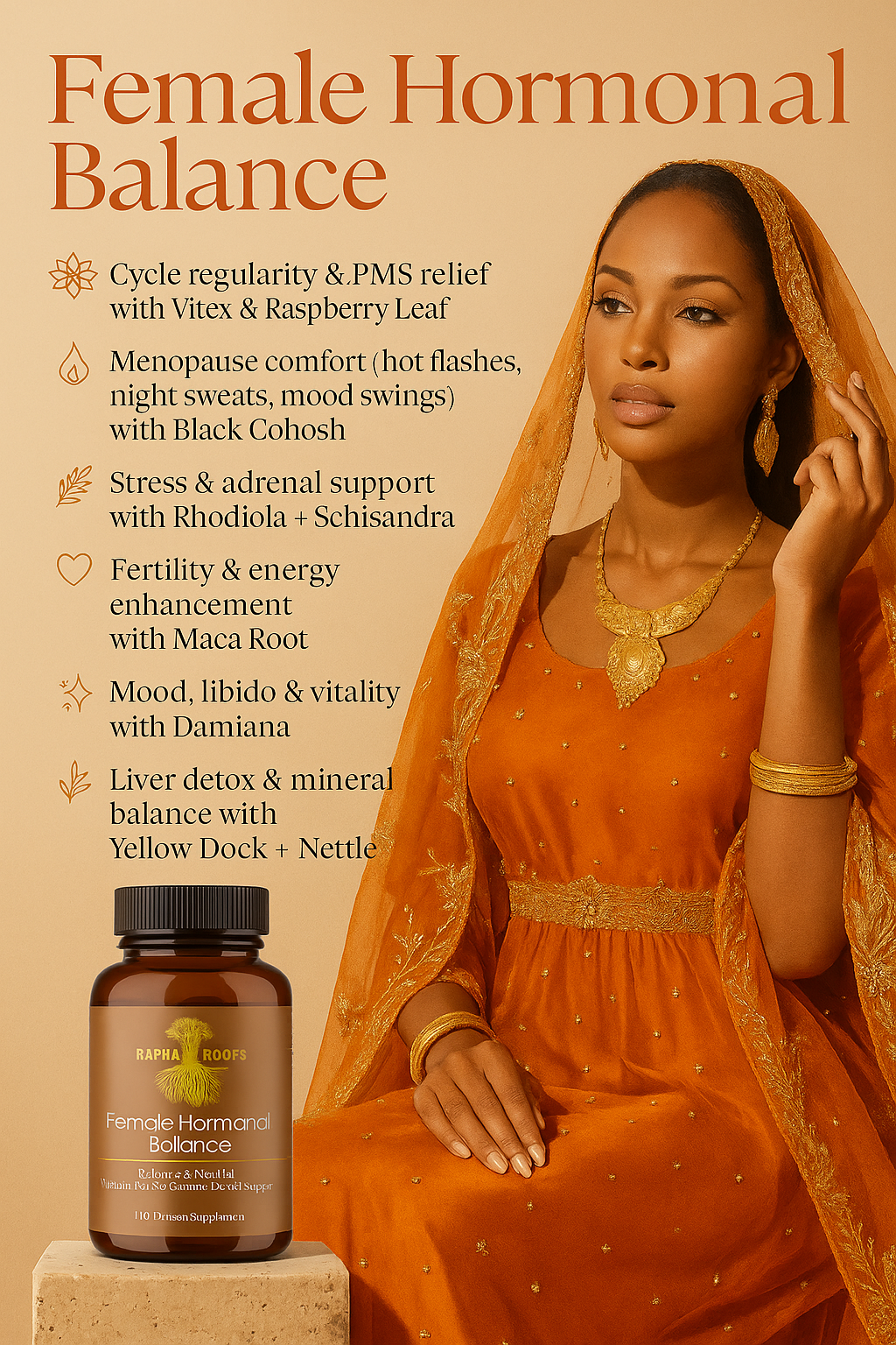Many hormone supplements rely on synthetic isolates or single compounds. At Rapha Roots, we use only whole, organic herbs like Vitex, Maca, and Rhodiola—delivering the complete range of phytonutrients nature intended. These plants work together to nourish the endocrine system, naturally restore balance, and ease monthly discomfort without disrupting your body’s rhythm.